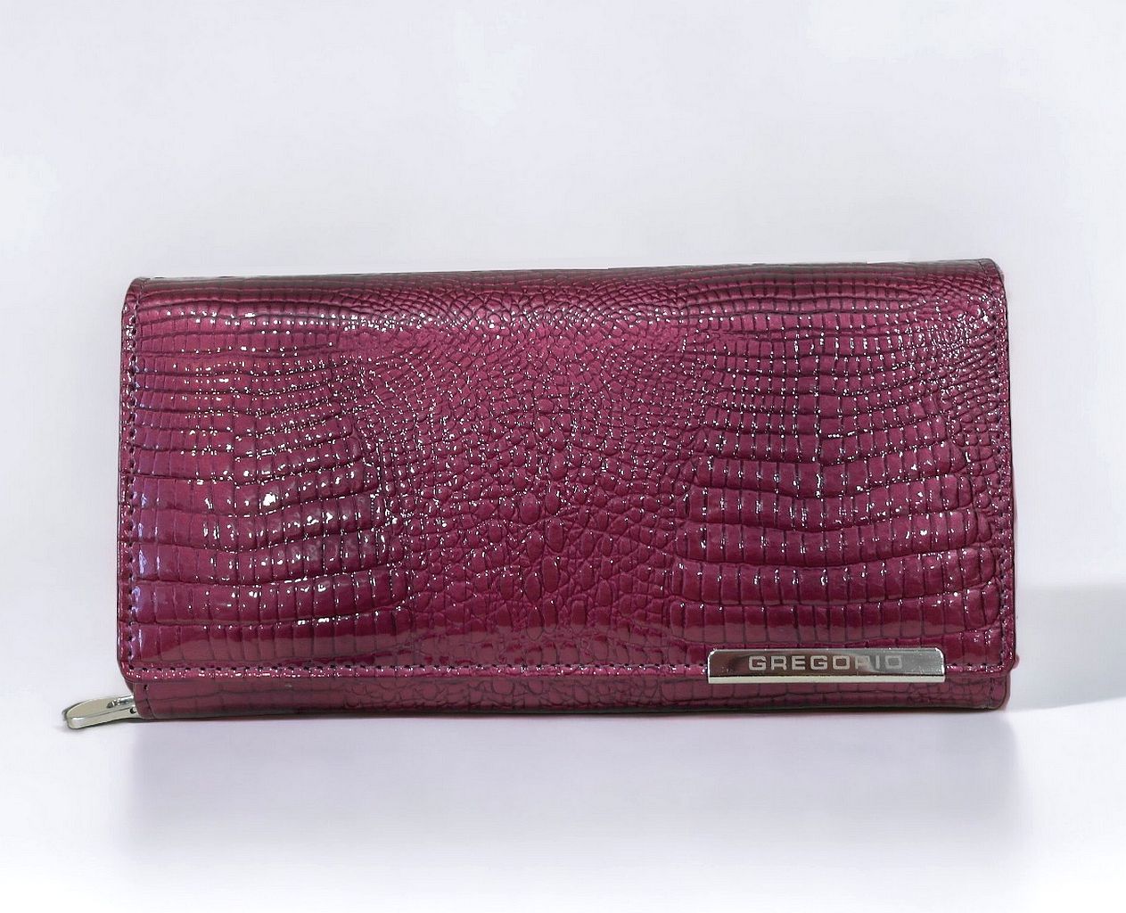 Bíborlila színű, krokodilmintás, nagy méretű Gregorio női bőr pénztárca.
