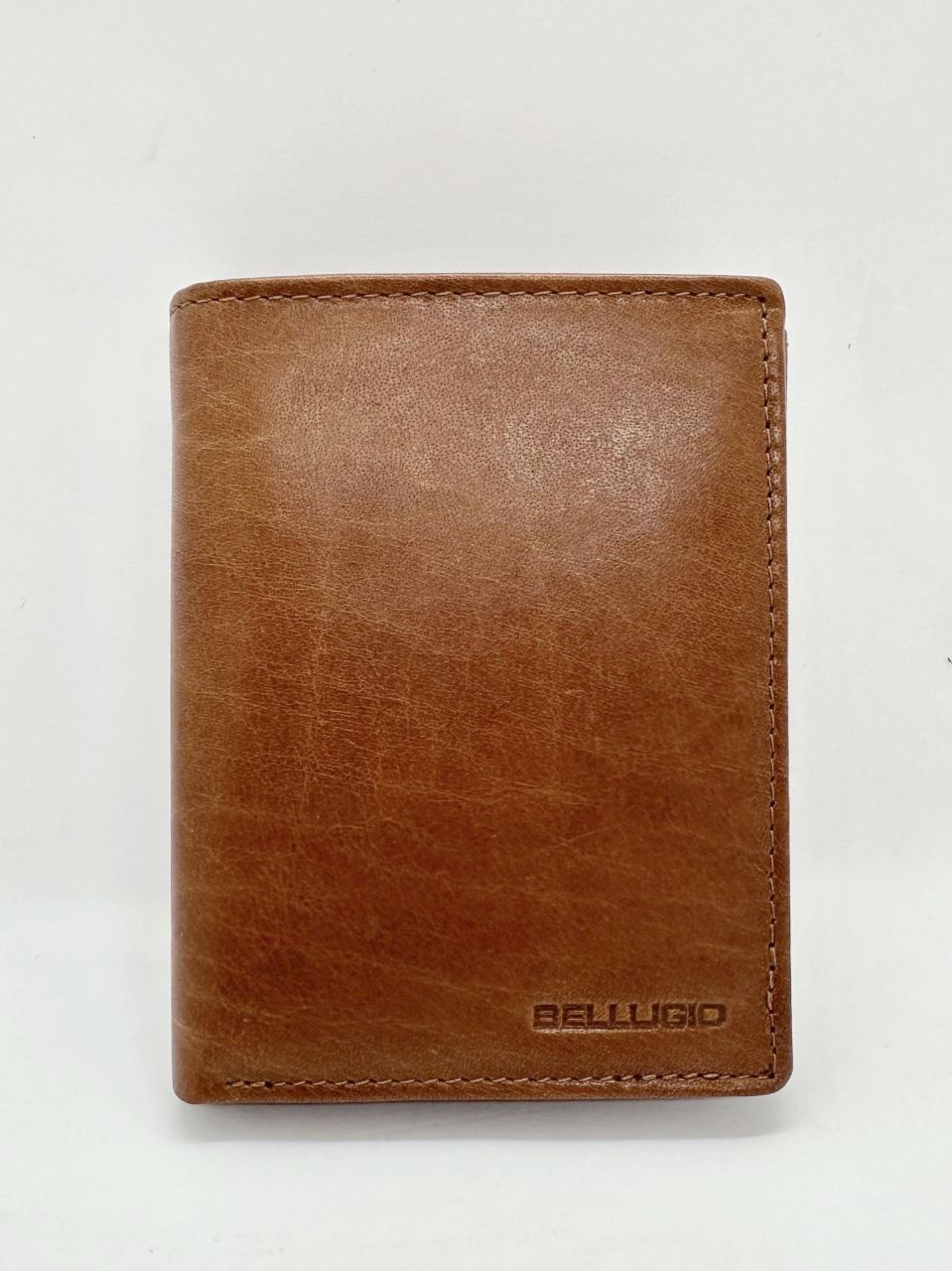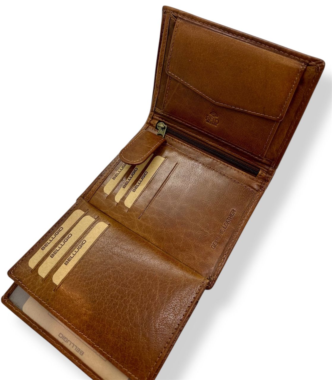 Barna (konyak) színű, férfi bőr pénztárca, díszdobozban. 9 db szabványméretű, 4 db nagyobb méretű kártyatartó található benne, amelyből 2 db, ablakos kialakítású.