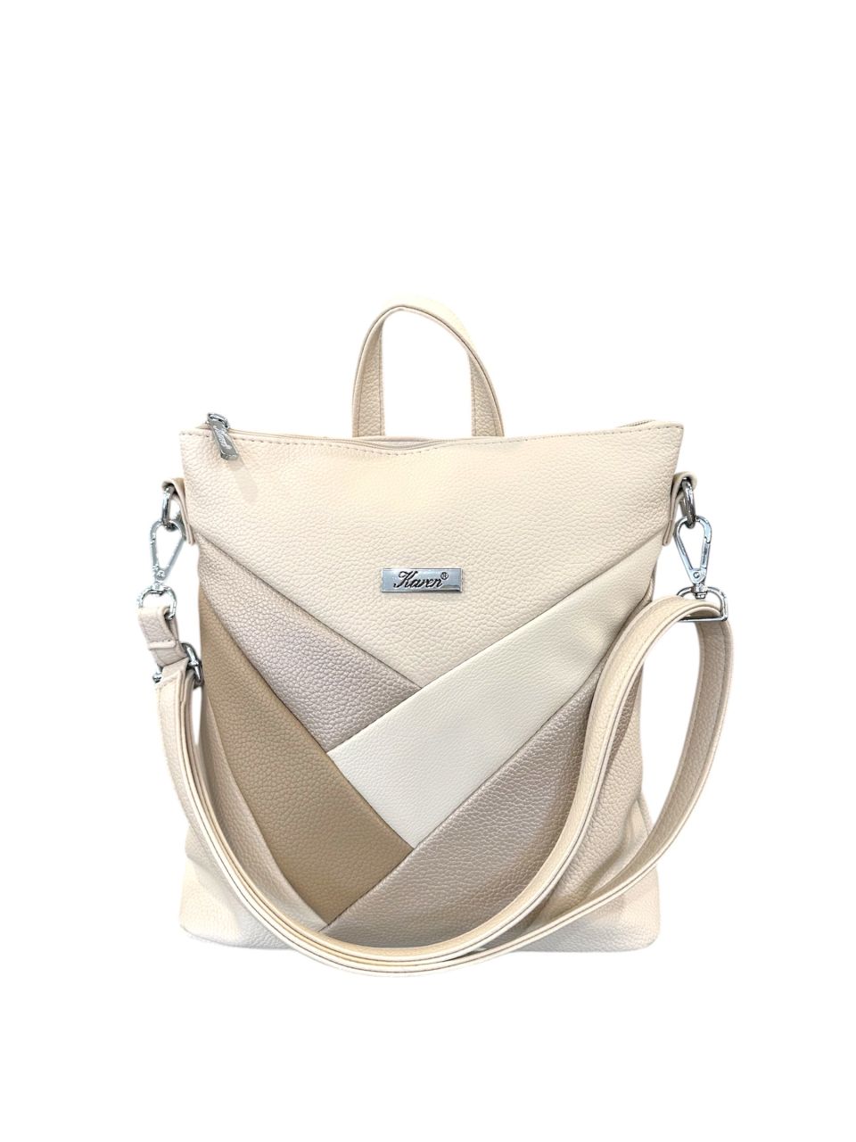 Bézs színű, különleges anyagberakásokkal díszített átalakítható női Karen táska. Közepes méretű. Hord a válladon, keresztben, vagy a hátadon, épp ahogyan kedved tartja! Praktikus belső zsekkel rendelkezik.