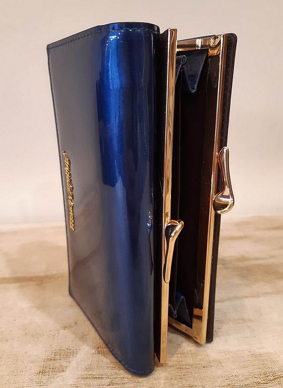 Kék színű Angela Moretti fényes lakkbőr pénztárca.
