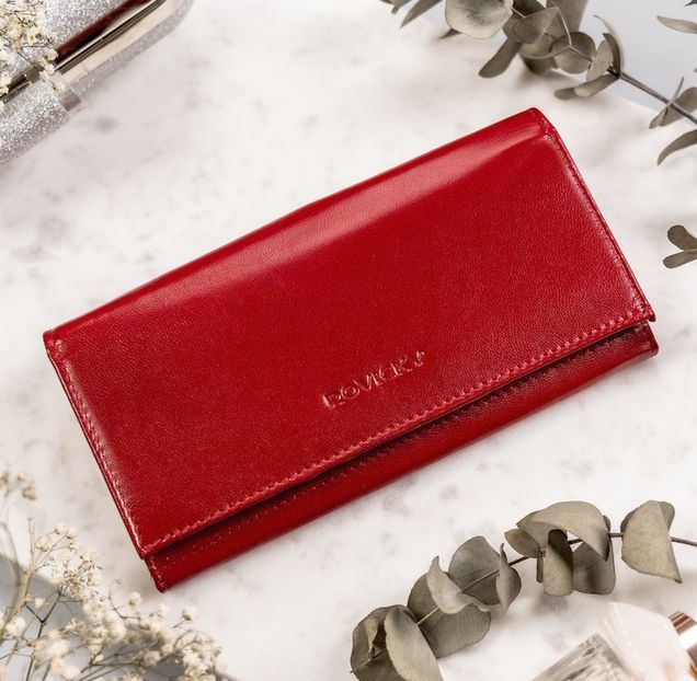 Piros színű, nagy méretű, női bőr pénztárca. Brifkó fazonú, így kényelmesen elérhetőek a papírpénzek, amelyeket kifektetve könnyedén el lehet helyezni. Belsejében keretes aprótartó található.