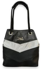 Fekete alapszínű, ezüsttel díszített, "bucket" fazonú női válltáska a Zelliatól. Rostbőr anyagból készült. Közepes mérete miatt, mindennapi használatra ajánljuk. Levehető, állítható hosszúságú vállpánttal rendelkezik. Belseje osztott kialakítású, zsebecskékkel ellátott.