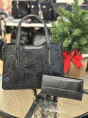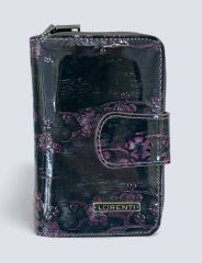 Fekete alapszínű, lila színű nyomott virágmintával díszített, álló kialakítású, lakkozott marhabőrből készült női bőr pénztárca. Kicsi mérete miatt kényelmesen elfér bármilyen táskában.