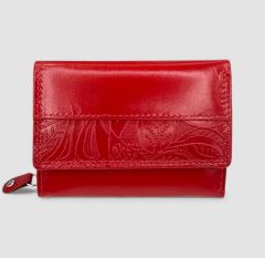 Piros színű, természetes bőrből készült női bőr pénztárca, nyomott virágmintával díszítve. Kicsi mérete miatt kényelmesen elfér bármilyen táskában. A Forint kényelmesen, fektetve elfér az egy részes készpénz tartóban.