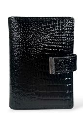 Türkizzöld színű, közepes méretű női lakkbőr pénztárca. A lakkbőr anyaga fényes hatású, krokodilbőr mintával díszítve. Belsejében külön kártyatartó rekesz található.