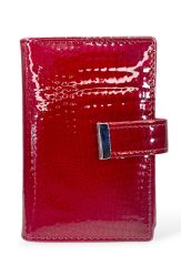 Piros színű, közepes méretű női lakkbőr pénztárca, krokodilbőr mintával díszítve. A pénztárca belül egy patenttal nyitható kártyatartó részt tartalmaz.