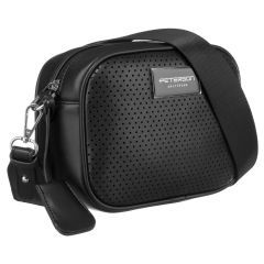 Fekete színű, sportos fazonú crossbody oldaltáska, széles szövet vállpánttal. Kicsi méretű, könnyű anyagból készült. Elejét apró lyukak díszítik.