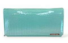 Türkizzöld színű, közepes méretű női lakkbőr pénztárca. A lakkbőr anyaga fényes hatású, krokodilbőr mintával díszítve. Belsejében külön kártyatartó rekesz található.
