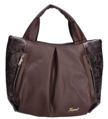 Csokibarna színű Karen táska, pántja hosszának köszönhetően kényelmesen vállon horható. Gyönyörű, fényes anyagú, nyomott virágmintával díszített betétek dobják fel a táska hangulatát. Osztott belső részének köszönhetően könnyedén megtalálható benne mindaz, amit keresel.