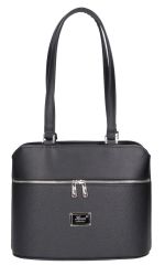 Fekete színű, közepes méretű, osztott belsőrésszel rendelkező Karen kézitáska. Merev falávak, nyomott mintájának és ezüst színű kellékeknek köszönhetően nagyon elegáns táska.
