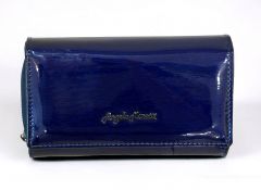 Sötét kék színű, vastag bőrből készült pénztárca. Felületét vízszintes csíkozás díszíti, amelyet egy fényes, enyhén csillogó lakk réteg borít. Közepes mérete miatt, megfelelően tárolható kisebb méretű táskákban.
