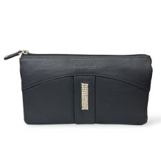 Fekete színű, puha falú, 3 rekeszes bőr pénztárca. Elejét fényes üvegkövek díszítik. Kényelmes kialakítása lehetővé teszi, hogy kifektetve tároljuk benne a papírpénzt és külön belső rekeszben az aprót.