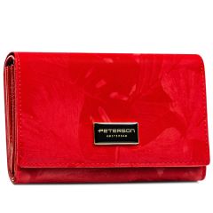 Közepes méretű, brifkó fazonú, piros női Peterson pénztárca. Belseje valódi bőrből, míg külseje vastag poliészter szövetből készült. Keretes, osztott belsővel rendelkező aprótartóval rendelkezik és 3 rekesz került kialakításra a papírpénznek, amelyben kifektetve tárolható a Forint.